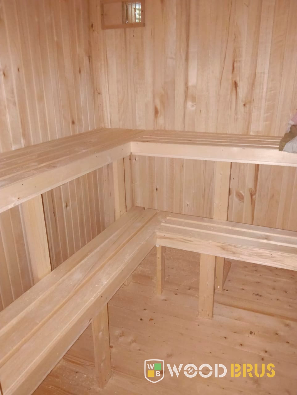 Построили одноэтажную баню из бруса по проекту "Рада". Размеры бани 6х8 м с террасой 2х6 м, а общая площадь составляет 48 м². Строили в Московской области. Брус 140х140 мм камерной сушки, перегородки из бруса 90х140 мм, сборка на березовые нагеля, фронтоны из доски 40х100 мм, стропила из доски 40х150 мм, лаги пола из доски 50х150 мм, обшивка имитацией бруса, обработка антисептиком (обвязка, лаги пола и черновой пол) на производстве.