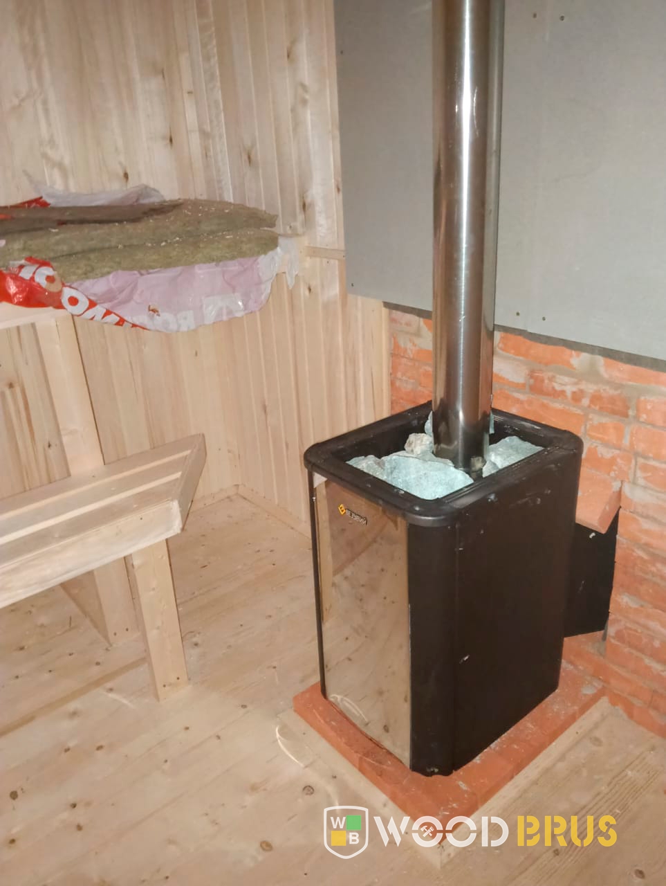 Утепление пола и потолка плитным «Rockwool Лайт Баттс» в 150 мм. В парной обшивка осиновой вагонкой, пол утепляется керамзитом, печь предоставляет заказчик. Окна ПВХ (с водоотливами и москитными сетками), водосточная система ПВХ, кровля металлочерепица, свесы крыши в 5 вагонок, высота 16 венцов. Фундамент: винтовые сваи. Стоимость на момент строительства: 1 808 000 рублей