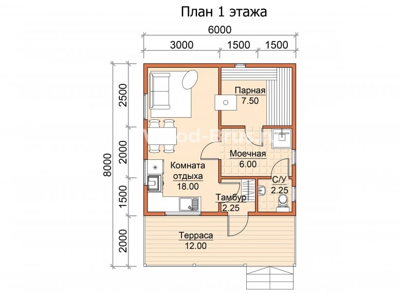 Баня из бруса 6х8 по проекту Рада в Московской области