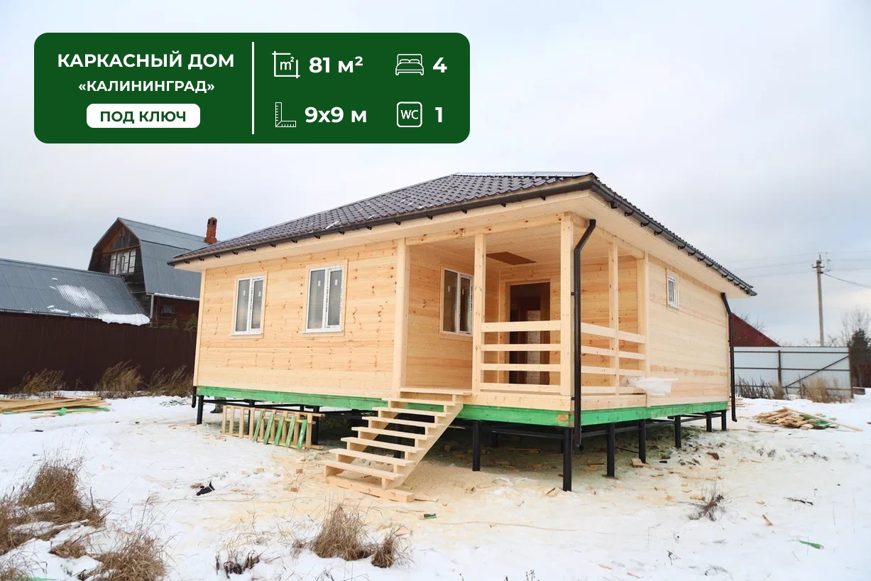 Построили одноэтажный каркасный дом по проекту «Калининград» в Дмитровском районе Московской области. Размеры дома 9х9 м, а общая площадь составляет 81 м².