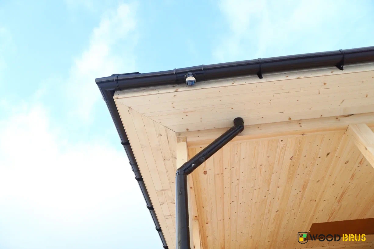 ✔Крыша вальмовая, кровля — металлочерепица (цвет «коричневый»). Свесы крыши: 45 см. Установлены окна ПВХ, а также водосточная система.
